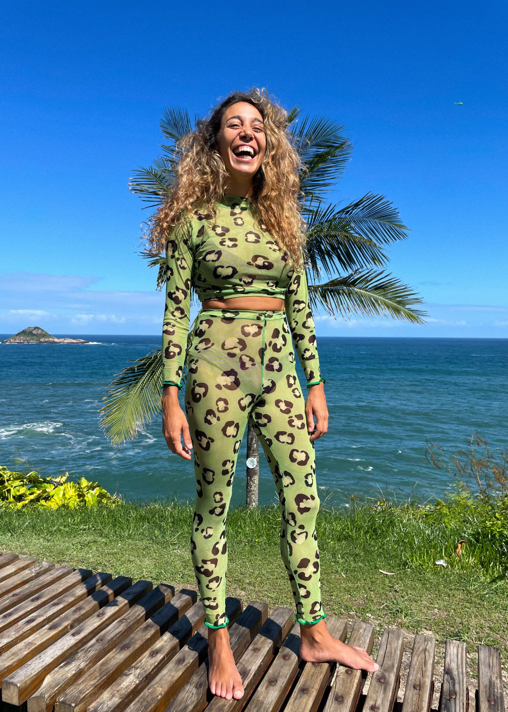 Blusa justinha, de manga comprida e golinha, modelo cropped, em tule malha com estampa de oncinha verde e preta.