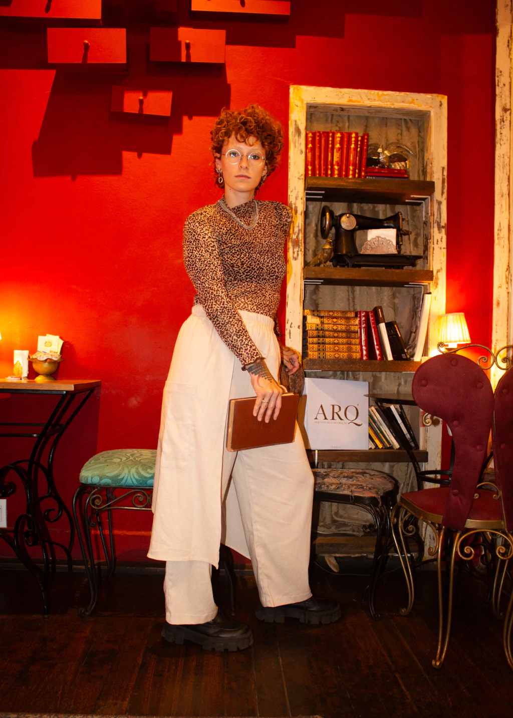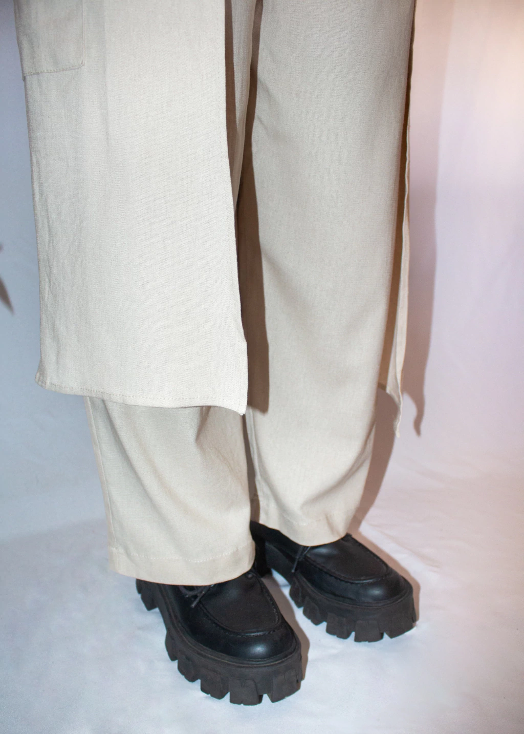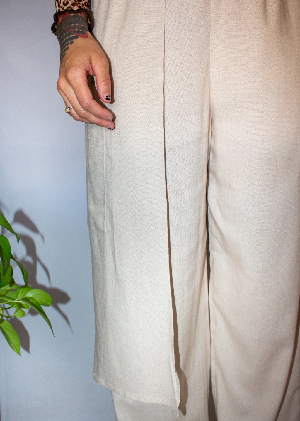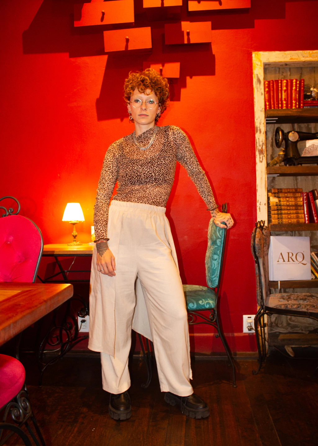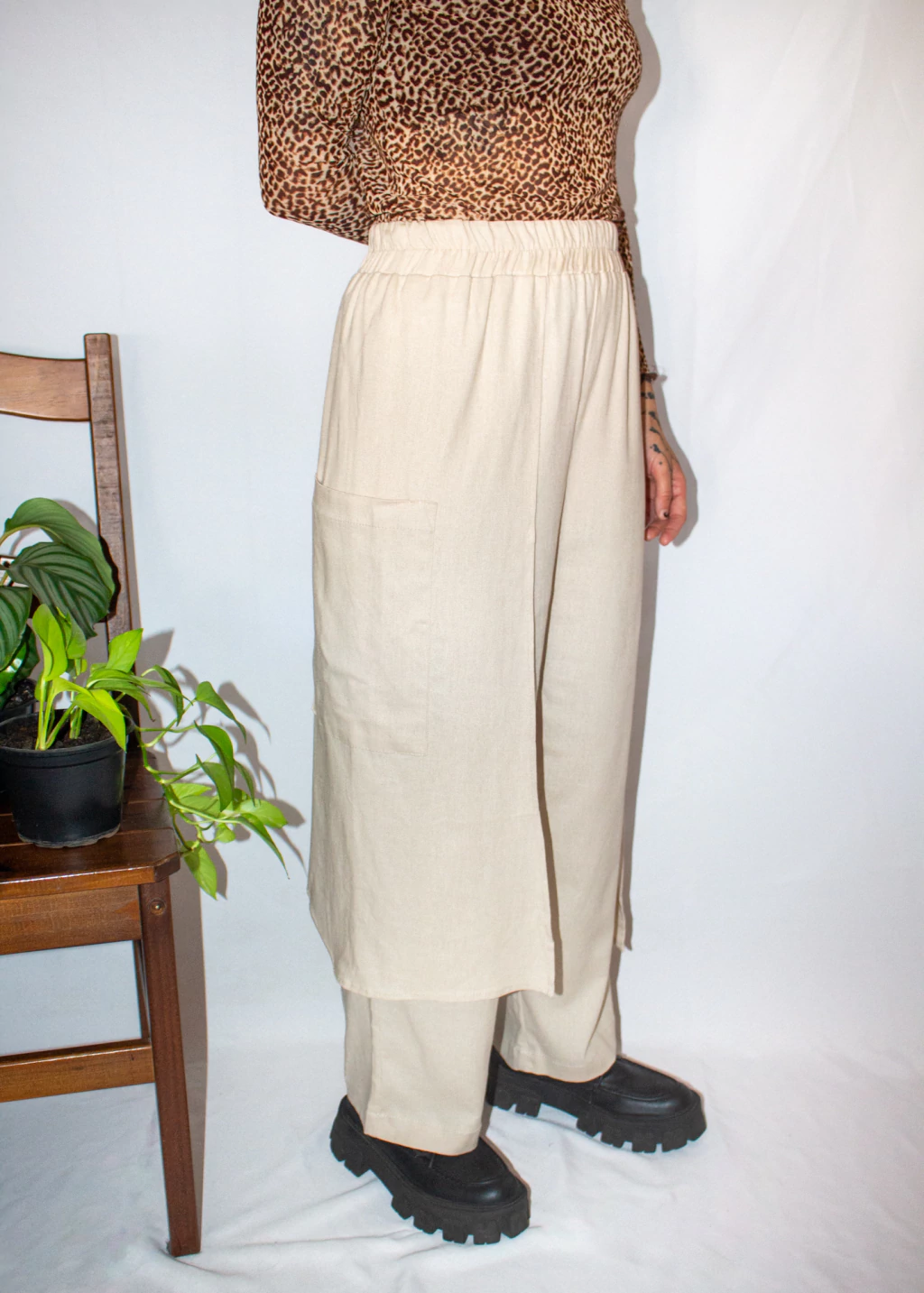 Calça-saia em linho misto, em cor crua, com modelagem reta na calça e panos sobrepostos à ela, elástico na cintura e bolso lateral.