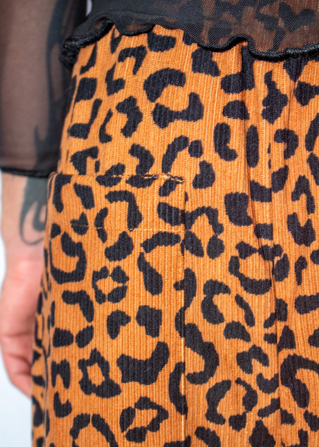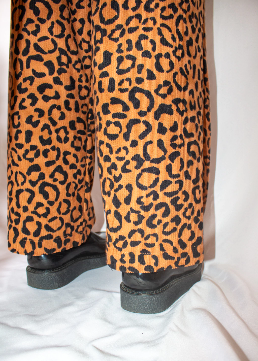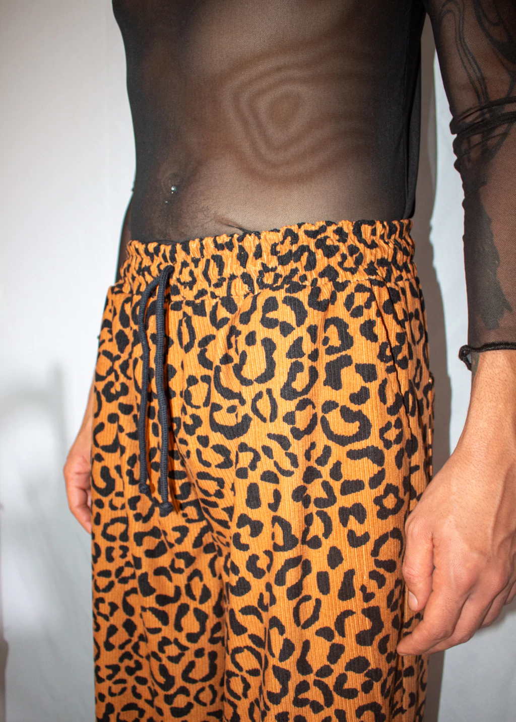 Calça em veludo cotelê, estampa de onça, com modelagem wide leg, elástico e cordão na cintura, bolsos laterais e na parte traseira.