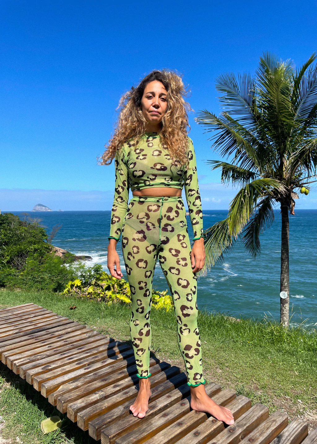 Calça legging em tule com elastico na cintura, acabamento em overlock na barra e estampa de oncinha laranja, rosa e preta. Blusa cropped de gola alta e manga comprida no mesmo tecido.
