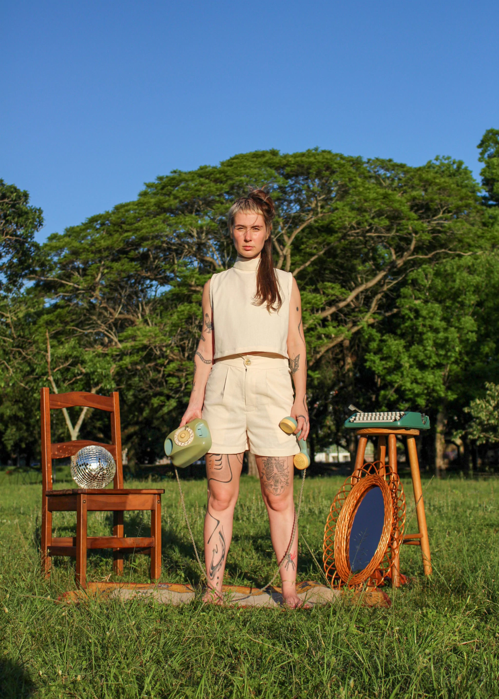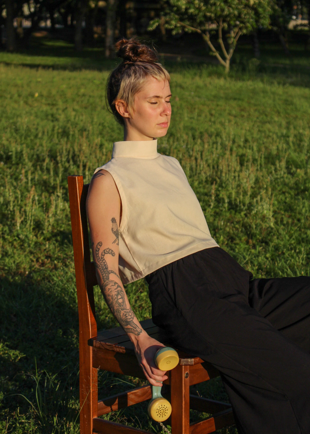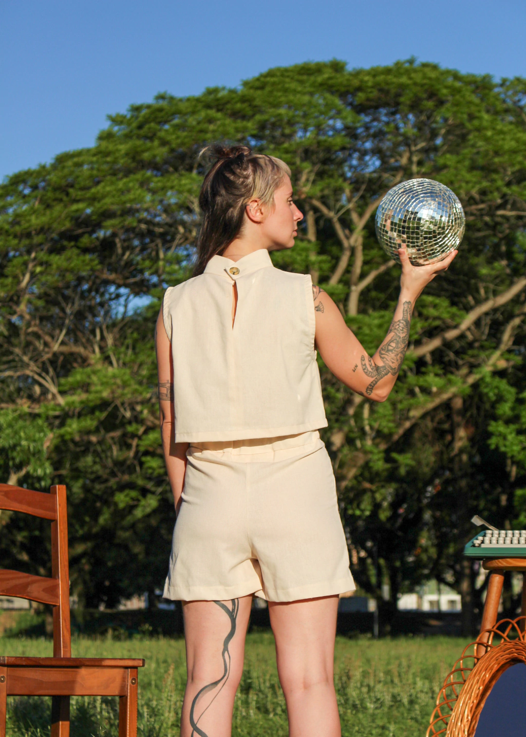 Blusa cropped, regata, com gola alta estruturada e fechamento atrás bom botão, modelagem soltinha, o comprimento pode variar de acordo com a preferência. Em linho com viscose cru.