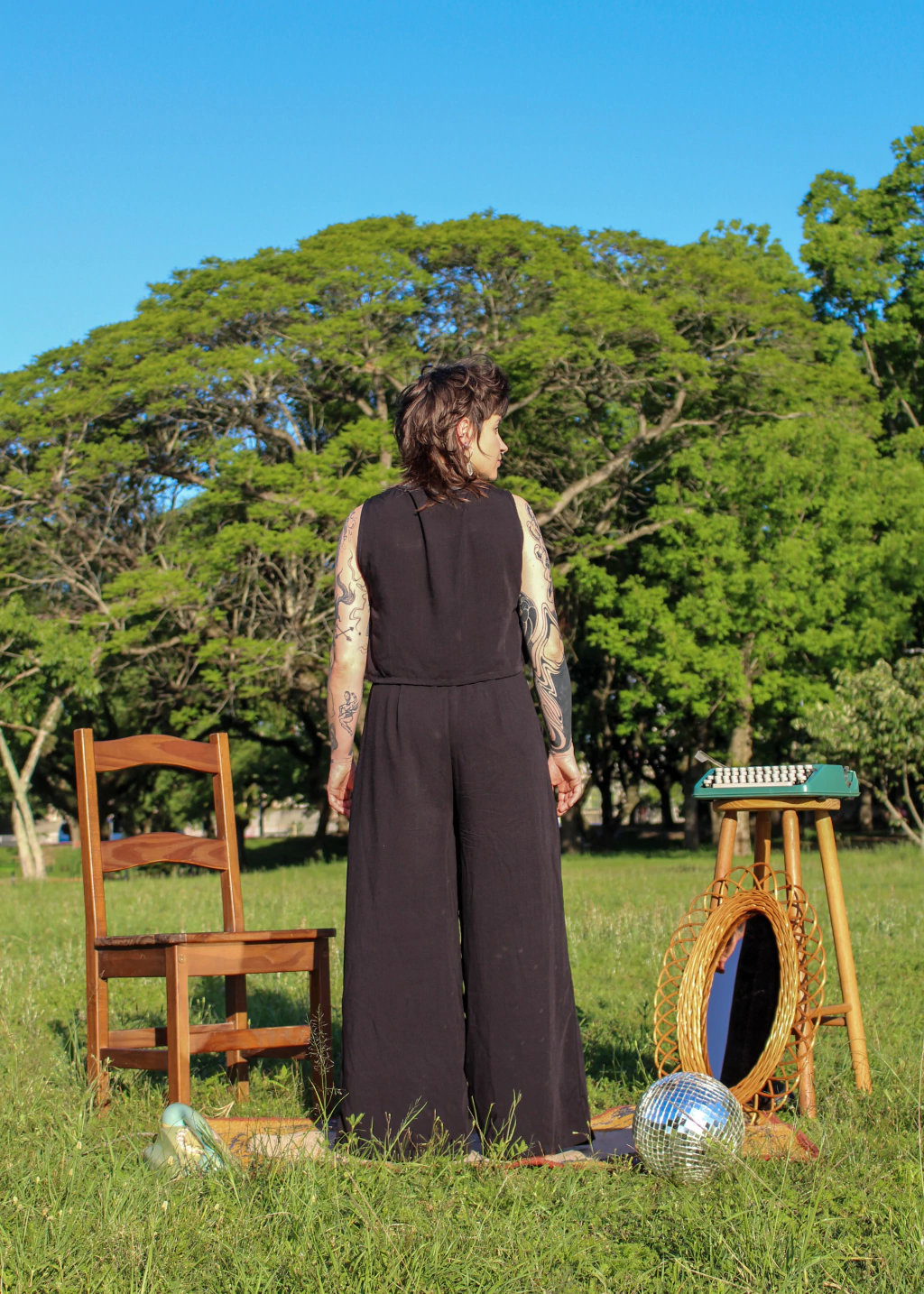 Blusa cropped, regata, com modelagem soltinha, o comprimento pode variar de acordo com a preferência. Em viscolinho preto.