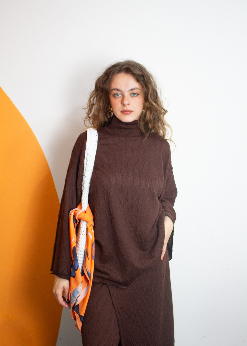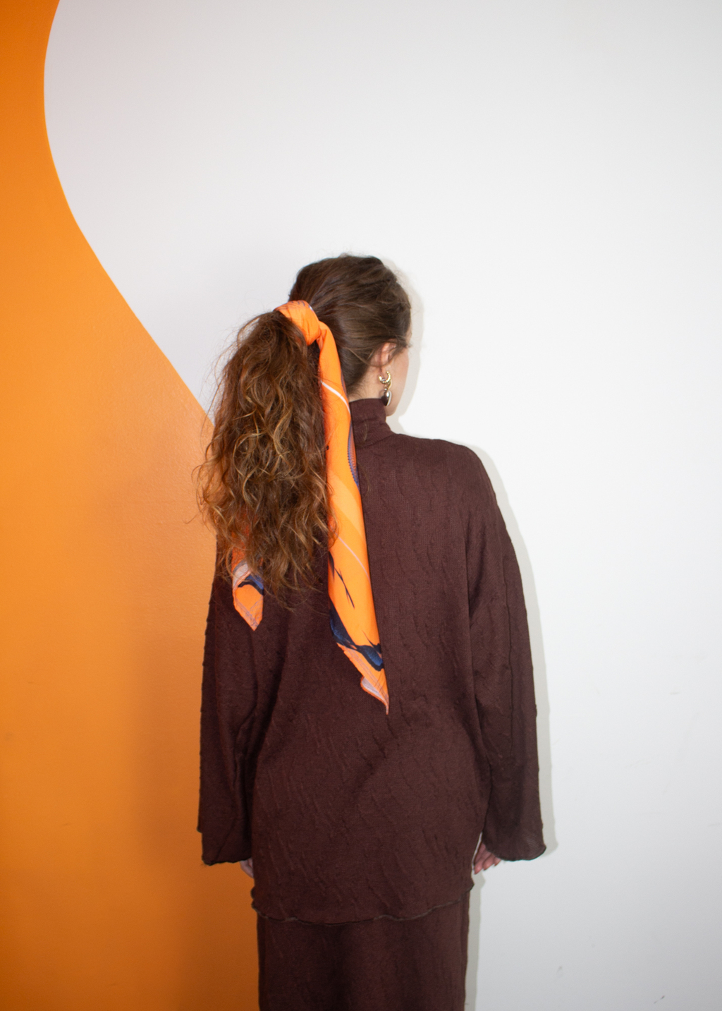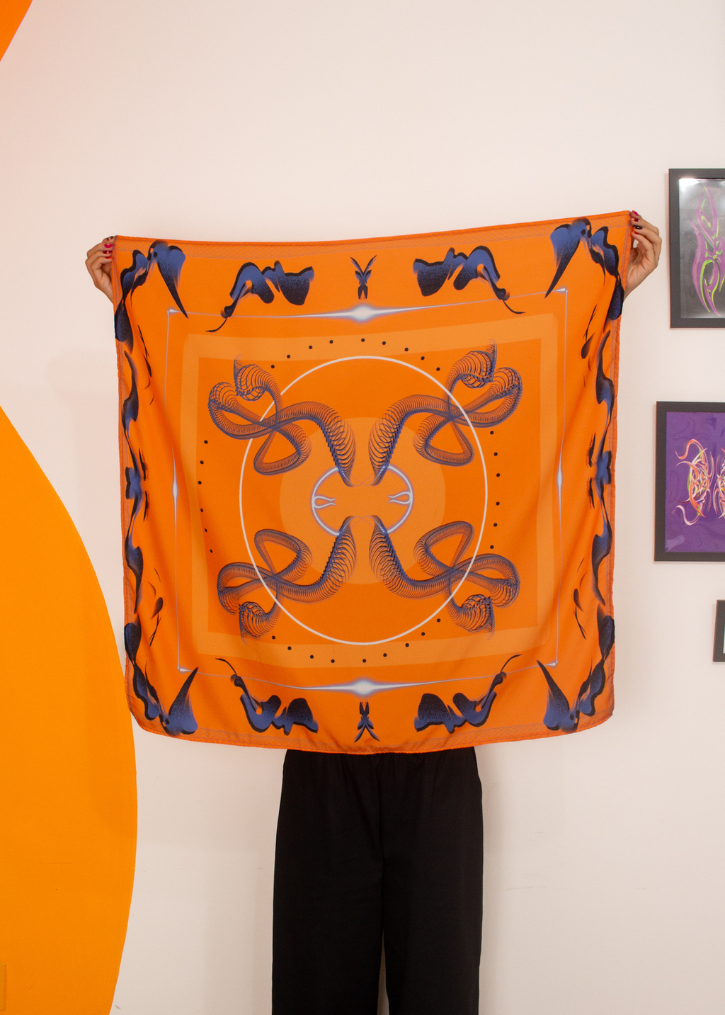 Lenço em crepe haya, com estampa autorial feita pela artista Nicole Martinato.