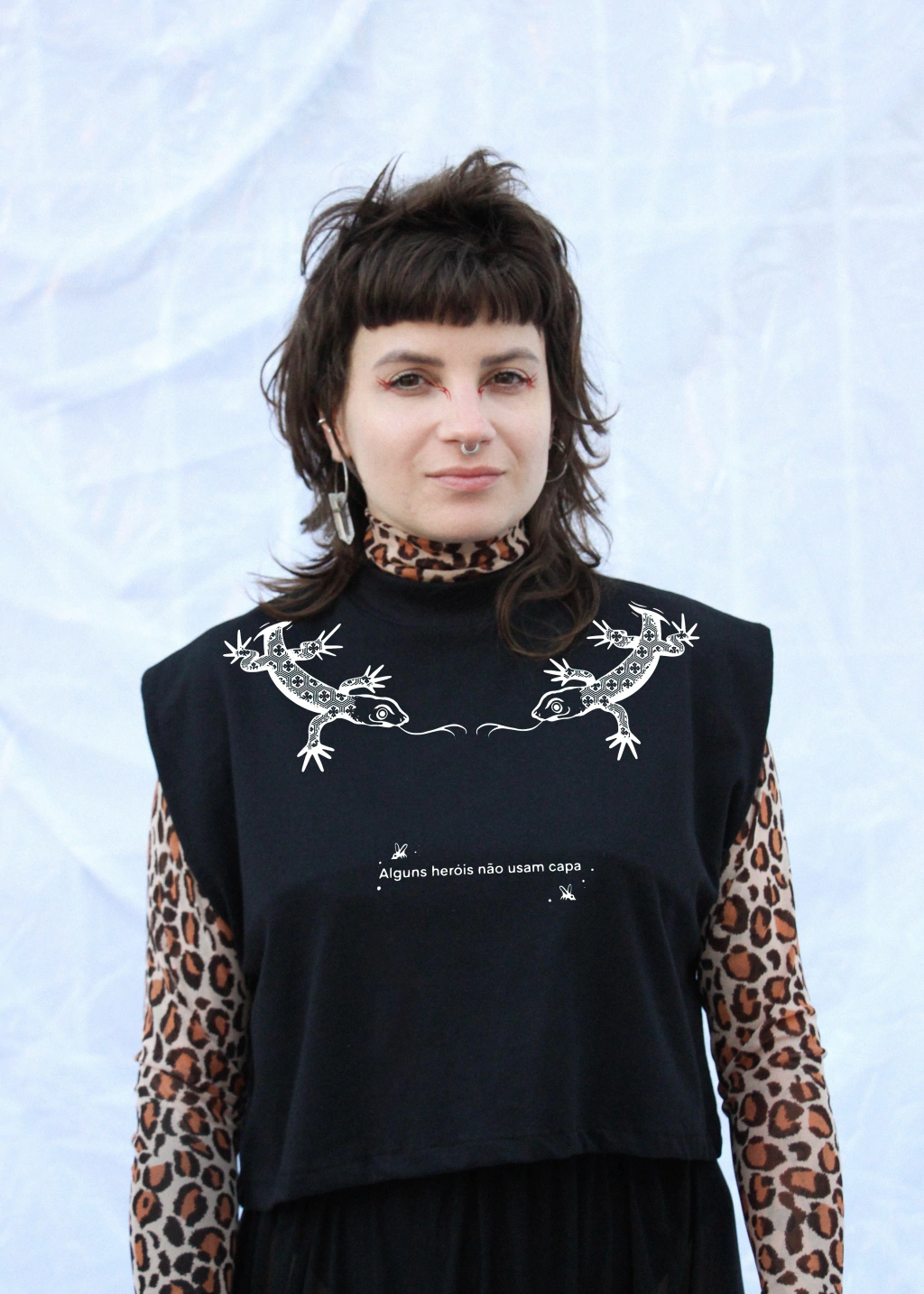 Regata cropped preta 100% algodão com modelagem oversized, cava deslocada e gola alta, estampa com duas lagartixas na cor branca fazendo o contorno da gola. No centro da camiseta em letras pequenas, a frase: "alguns heróis não usam capa" e 2 mosquitinhos voando. Estampa feita em serigrafia e arte feita por Cainã Costa.