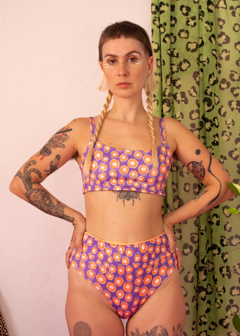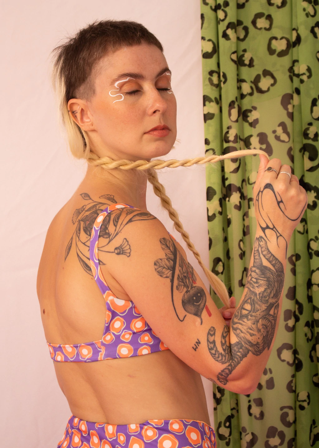 O clássico top de alcinha mas dessa vez com as costas abertas, pra ficar ainda mais fresquinho e estiloso. Em malha amini com estampa autoral de ovo frito invertido.