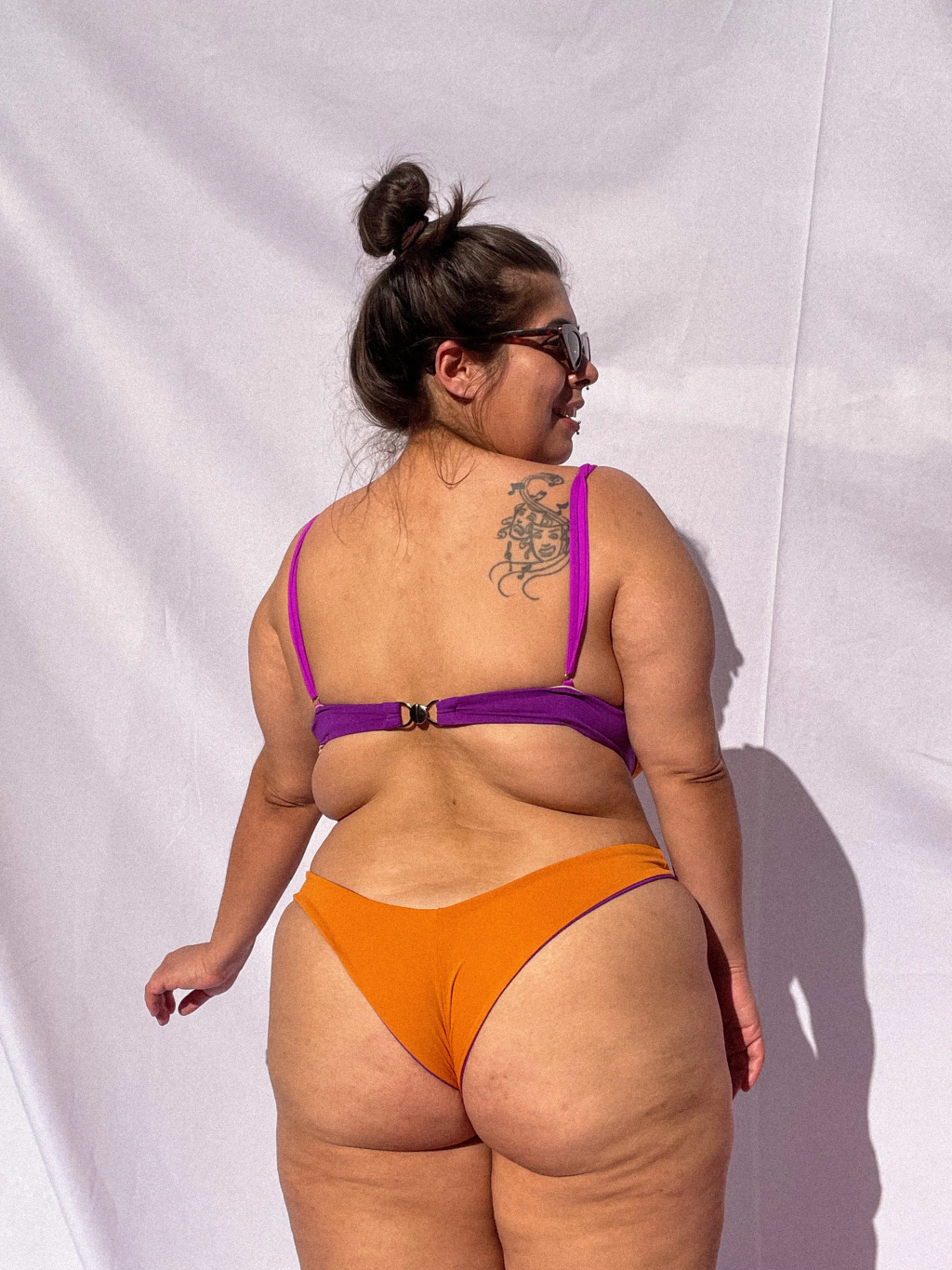 Top de biquini com modelagem meia taça em tecido amini laranja, roxo e roxorosa.